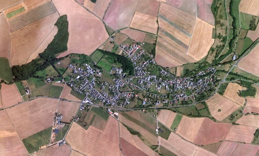 Das Flugzeug von Vlatten - Der kleine Ort bei Zülpich ist auf erste Besiedlungen der Franken zurückzuführen. Wer mit dem Auto die Umgehungsstraße verläßt, kommt in ein Dorf, welches ähnlich wie Sievernich an die ersten Besiedlungen erinnert. Betrachtet man rein den besiedelten Kern des Ortes, so sieht man die Umrisse eines Flugzeuges (von links nach rechts fliegend). Betrachtet man die grün gekennzeichneten Wiesen und Flußauen, so erkennt man den unten abgebildeten Hai. Die Umgebung von Zülpich steht mehrfach für die Frühbesiedlung durch Franken und Römer und wird in Kreisen der Nibelungenforscher als mögliche Stätte des Geschehens um die Nibelungen angesehen. Als dritte Interpretationsform läßt sich ein fliegender Vogel (Taube?) von rechts nach links fliegend erkennen. |