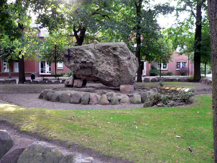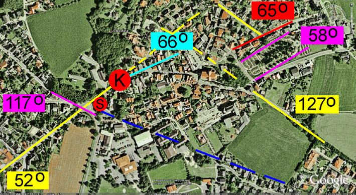 In den nordöstlichen Dammer Bergen fanden sich in Steinfeld und Mühlen Kalenderlinien innerhalb der Orte. Anhand einer Google-Analyse, Begehung und Auswertung von Karten mittels Azimutwertberechnung konnte ein vermutetes Kalendersystem sichtbar gemacht werden. Steinfelder Betrachtungen Der Ort Steinfeld selbst besitzt einen als Kriegerdenkmal ausgewiesene Kultstätte, die in der Nähe eines vermuteten Kalendermittelpunktes (K) bzw. einer ehemaligen kreisförmigen Anlage liegt, der auf der Karte in Abbildung 2 als S (Stein) markiert ist. Solche Stätten sind, wie beim Goloring oder sonstigen Vorzeitkreisen mit Steinen oder Pfosten markiert, lassen sich jedoch in Steinfeld wegen der Bebauung nicht auffinden. Etwa in der Nähe des Mühlenbaches befindet sich eine Fahrschule in einem kleinen Haus, in dessen Nähe sich ein Ort der Kraft befindet.