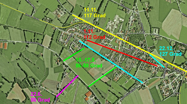 Beltaine am Kultplatz Eine Halloween-/Allerheiligenlinie bei 111 Grad kann nur als unterbrochen blau eingezeichnete Linie im Neubaugebiet vermutet werden. Mühlener Betrachtung Die innerhalb des Ortes Mühlen gefundenen Haupt-Kalenderlinien stehen für 1.11., 11.11., 22.12. 22.6. Ein Verlauf der im Südosten gelegenen Münsterlandstraße entspricht der Sophienlinie 15.5. und verläuft auf einen Punkt an der Ecke Dorfstraße / Schützenstraße / Am Schulplatz, der als Kalendermittelpunkt angesehen werden kann. Im Bereich von Mühlen kommt die Sophienlinie (Eisheiligen) mehrfach vor.