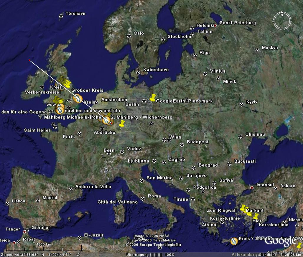 Globales Liniensystem Eine Überprüfung der Linie zur WSW vom Keltenring zum Goloring ergab eine Verlängerung nach England und Irland im Nordwesten und eine Verlängerung zur Türkei und nach Saudi-Arabien bzw. Somalia im Südosten. Eine Überprüfung hat ergeben, daß die von Radiästheten bekannten sogenannten Leylinien teilweise auf Kalenderlinien verlaufen. |