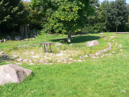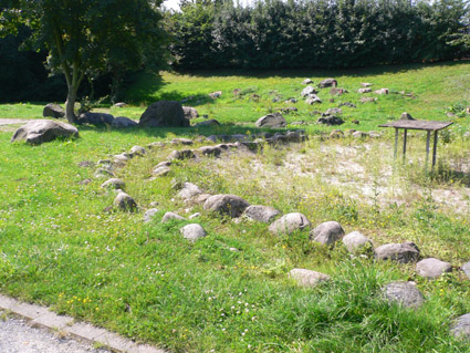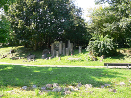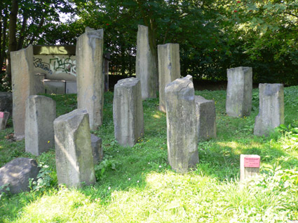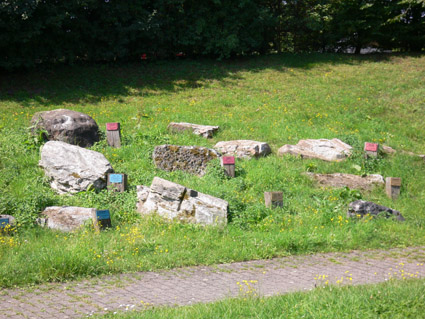 Bergheim-Zieverich. Was hier wie eine vorzeitliche Kultstätte anmutet, ist eine künstliche Steingruppierung zu Lehrzwecken. Eine Eifeler Mineralgeologische Gesellschaft bietet hier einen Steinlehrpfad an. Die Steine sind aus verschiedenen Materialien, wie Tonschiefer (500 Mio Jahre alt), Brachiopoden (400 Mio), Dolomit (400 Mio), Marmor (400 Mio), Paragneis (400 Mio), Serizit-Gneis (400 Mio), Keratophyr (400 Mio), Diabas (350 Mio), Sandstein mit Pflanzenabdrücken (300 Mio), Rhyolith (250 Mio), Trachyt (20 Mio), Kugelbasalt (20 Mio), Säulenbasalt (20 Mio). |