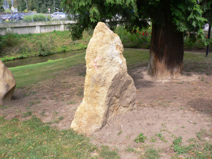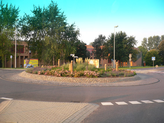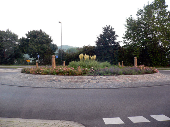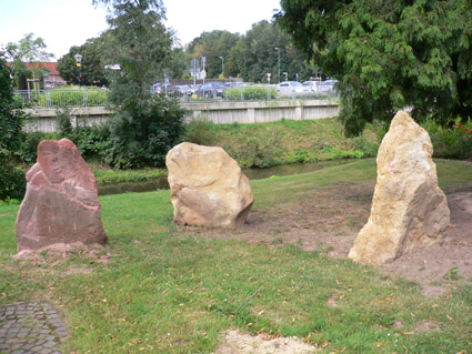Bergheim-Kreishaus. An Menhire oder einen Steinkreis erinnern diese Skulpturen am Bergheimer Kreishaus. Der Verkehrskreisel dient als Kunstobjekt und bildet ein Verbindungsglied zwischen megalithischer Kultur und Gegenwart. |