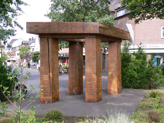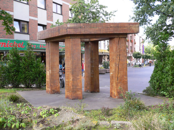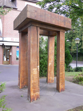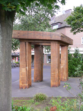 Bergheim/Erft. Motive von Kunstobjektem und Bauten der Gegenwart lehnen sich mitunter an die Megalithzeit an. Neben der Einbringung von Findlingen und Gedenksteinen in Gärten und Parks dienen große Markiersteine als Hinkelstein- oder Stelenersatz. Die einst von den Germanen eingeführte Ächtung des Steinkultes führte zur Zerschlagung der megalithischen Zeugnisse. Heute tragen Aufklärung und distanzierte Betrachtung zur kulturellen Rückbesinnung und heimatlichen Betrachtung bei. Größere Steinsetzungen und Errichtungen von megalithischen Kunstdenkmälern lassen sich als eine Renaissance der Vorzeitkultur interpretieren. Ähnlich wie Pyramiden oder Hünengräber stehen megalithische Bauwerke an der Grenze zur Vorzeit oder zum Jenseits. Von Orten landschaftlicher Besinnlichkeit oder Einbettung in die Natur dringen Kunstobjekte in belebte Gegenden und Stadtzentren vor. In weitestem Sinne berühren sie die Volksseele und erinnern an die ersten Bauten der Menschheit. |